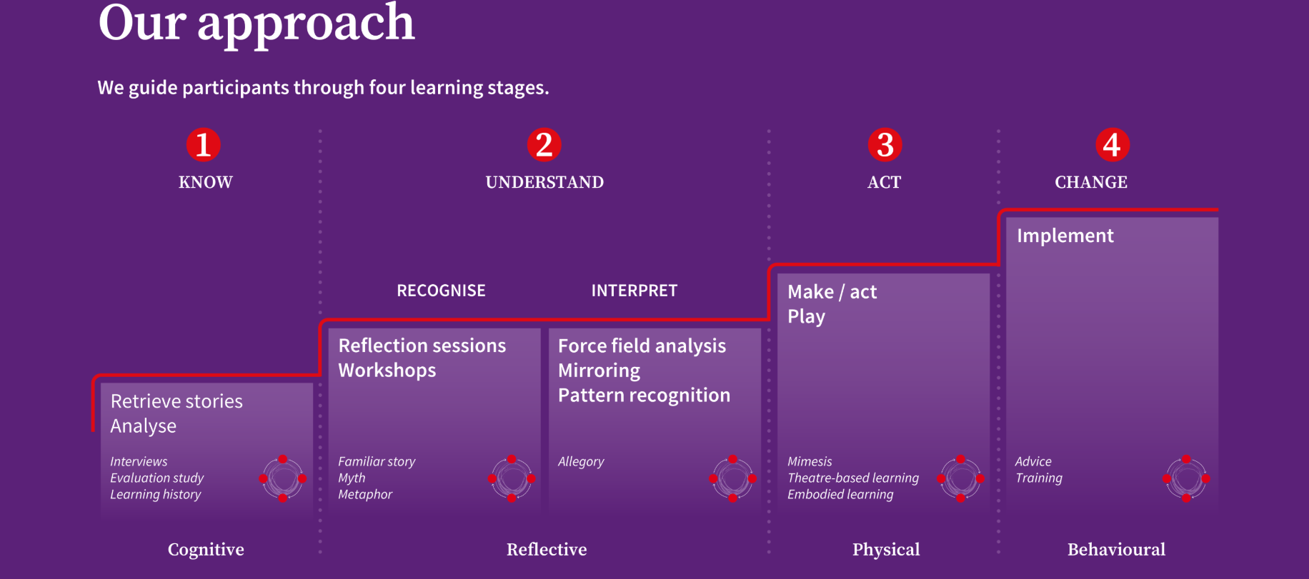 ‘Lessons learned’ are only ‘learned’ when the lessons have been experienced and implemented. Theater anticipates this. After all: by playing a change, you experience as an individual, as a team and as an organization what that change means for, for example, collaboration, communication, organizational culture, positioning. Theatre-based learning involves experiencing theater (reception), making it yourself (production), and thinking about meaning (reflection). Think of a theater performance, a theater workshop or reflection play.